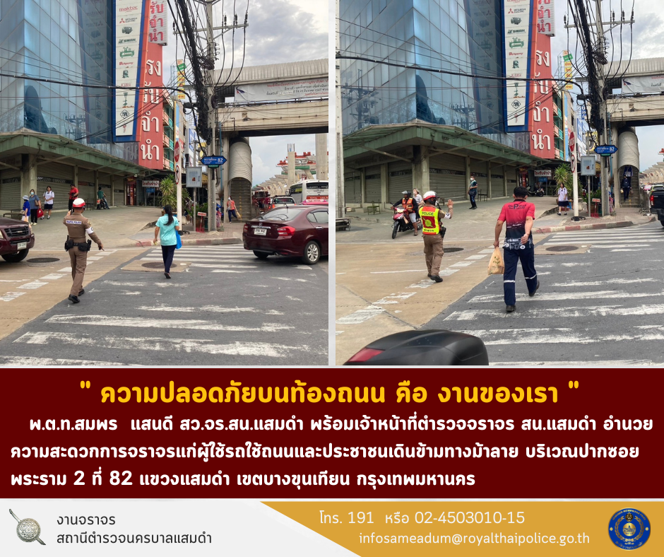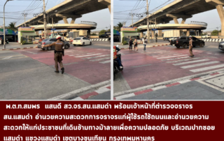 พ.ต.ท.สมพร แสนดี สว.จร.สน.แสมดำ พร้อมเจ้าหน้าที่ตำรวจจราจร สน.แสมดำ อำนวยความสะดวกการจราจรแก่ผู้ใช้รถใช้ถนนและอำนวยความสะดวกให้แก่ประชาชนที่เดินข้ามทางม้าลายเพื่อความปลอดภัย บริเวณปากซอยแสมดำ แขวงแสมดำ เขตบางขุนเทียน กรุงเทพมหานคร [...]
